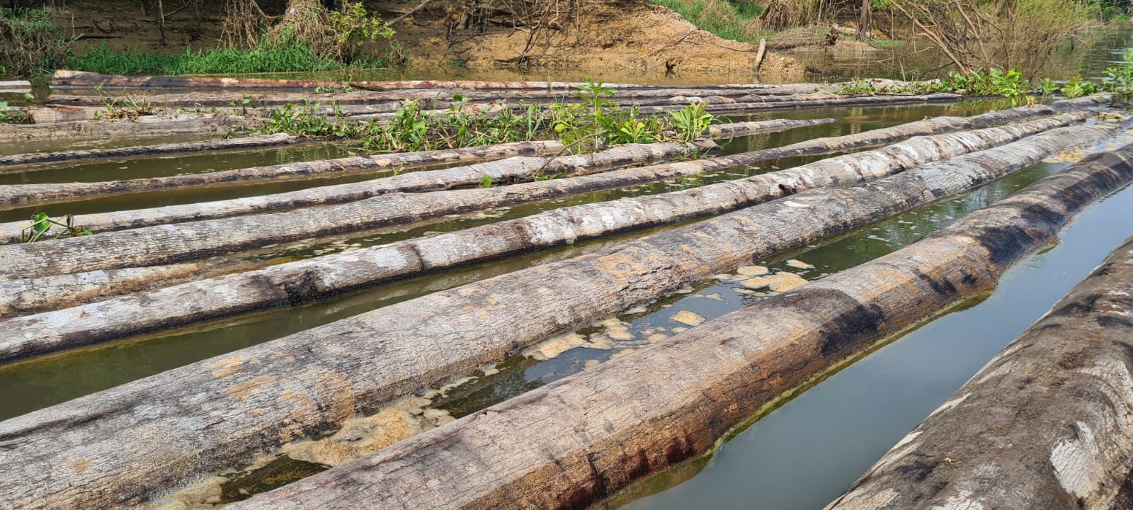 As madeiras de origem ilegal foram encontradas abandonadas em duas jangadas, próximo à comunidade Linda Conceição. Walben Ferreira, assessor técnico da Secretaria de Estado do Meio Ambiente (Sema), responsável pela gestão da área, explica que a madeira pode ter sido abandonada quando os infratores foram informados sobre a ida da polícia.