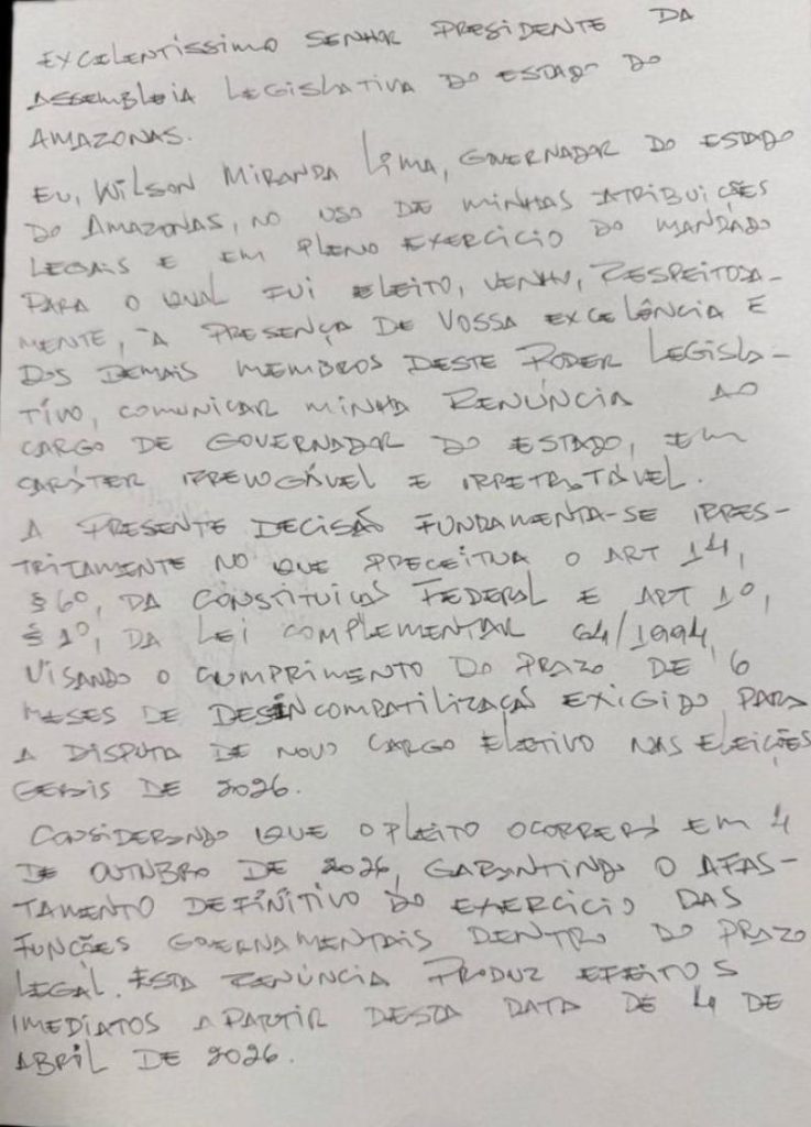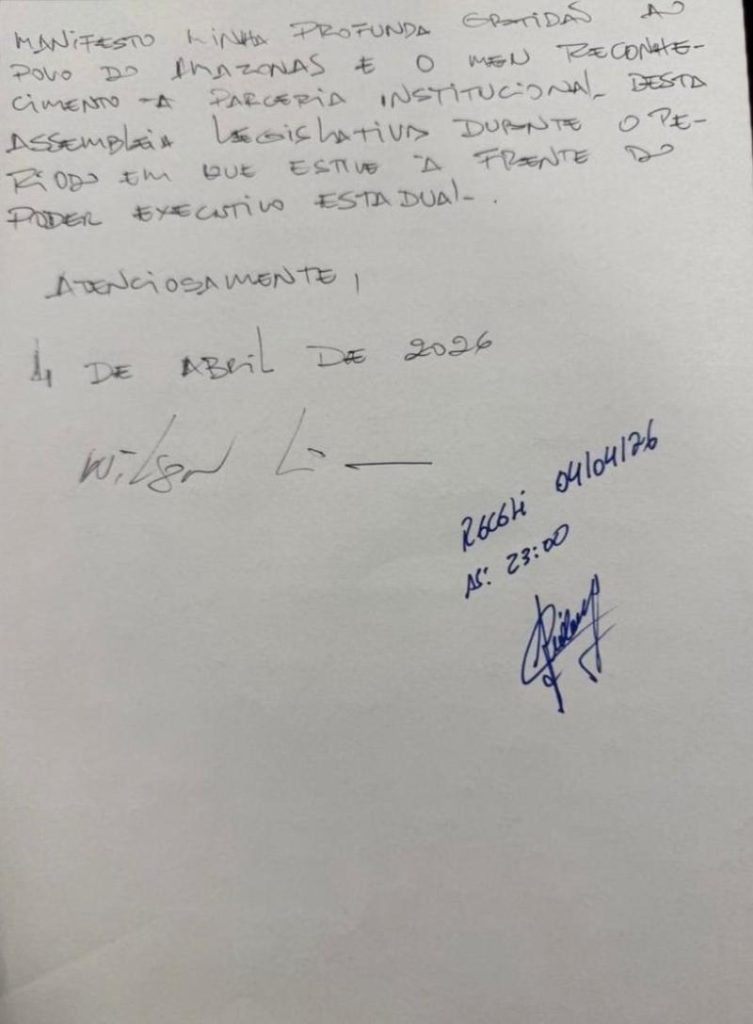 A decisão foi construída dentro das regras eleitorais e executada no limite do prazo legal. Ao deixar o cargo, Wilson Lima se posiciona para disputar o Senado Federal, enquanto Tadeu de Souza deve buscar uma vaga na Câmara dos Deputados.