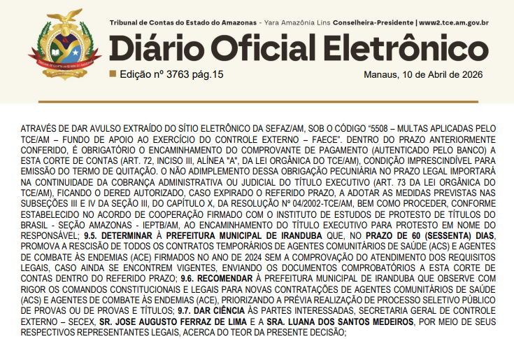Além da multa, o Tribunal determinou que a Prefeitura de Iranduba rescinda, em até 60 dias, todos os contratos temporários firmados em 2024 para as funções de ACS e ACE que não atendam aos requisitos legais. Caso os vínculos ainda estejam ativos, o município deverá comprovar a regularização junto ao órgão de controle.